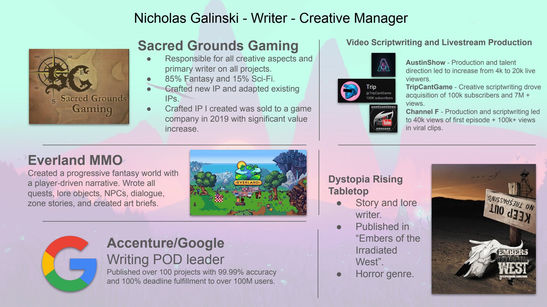 My career highlights include being a part of the launches for Google Pixel, Bard, and Search products, selling the intellectual property of Sacred Grounds Gaming to Salt & Pepper Gaming, and creating the story of Everland.