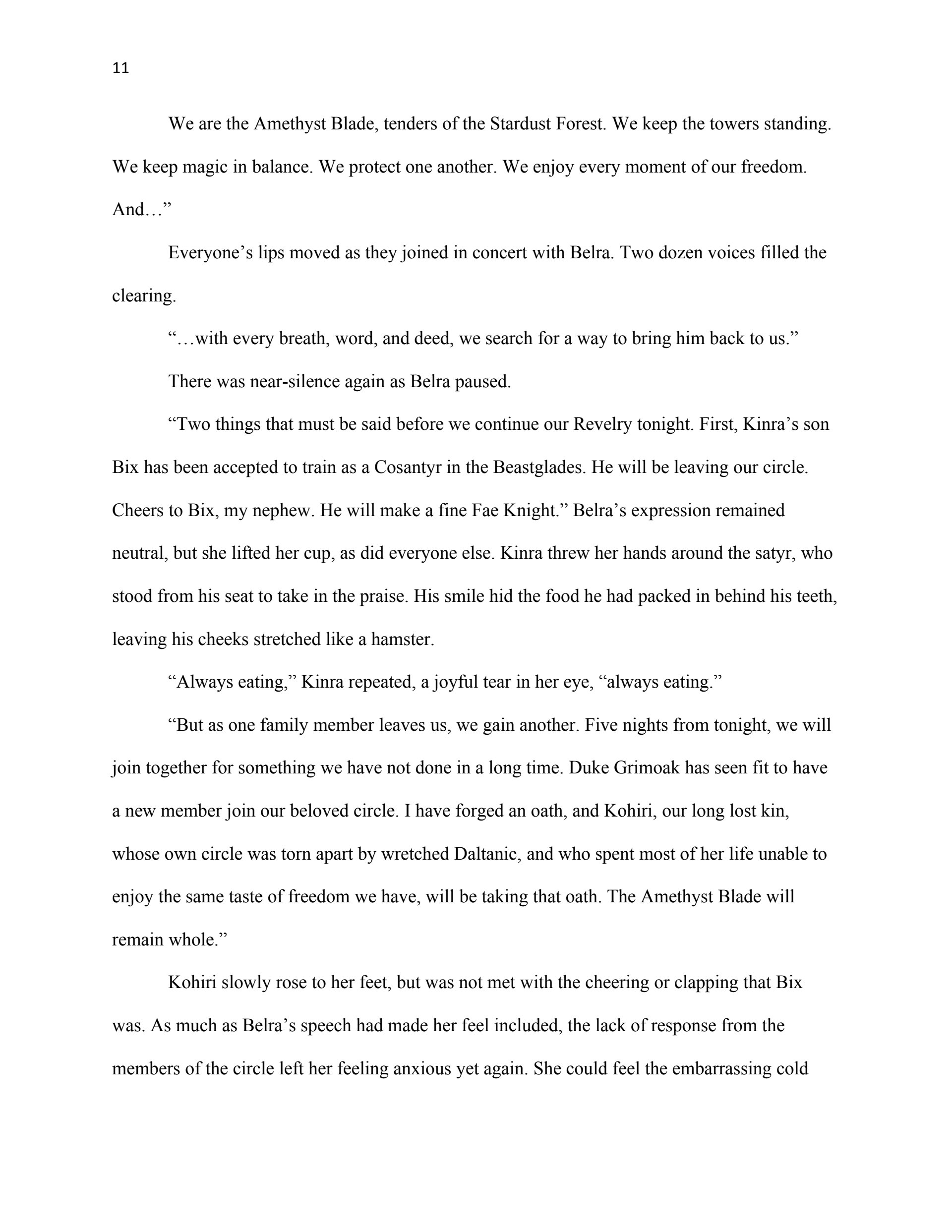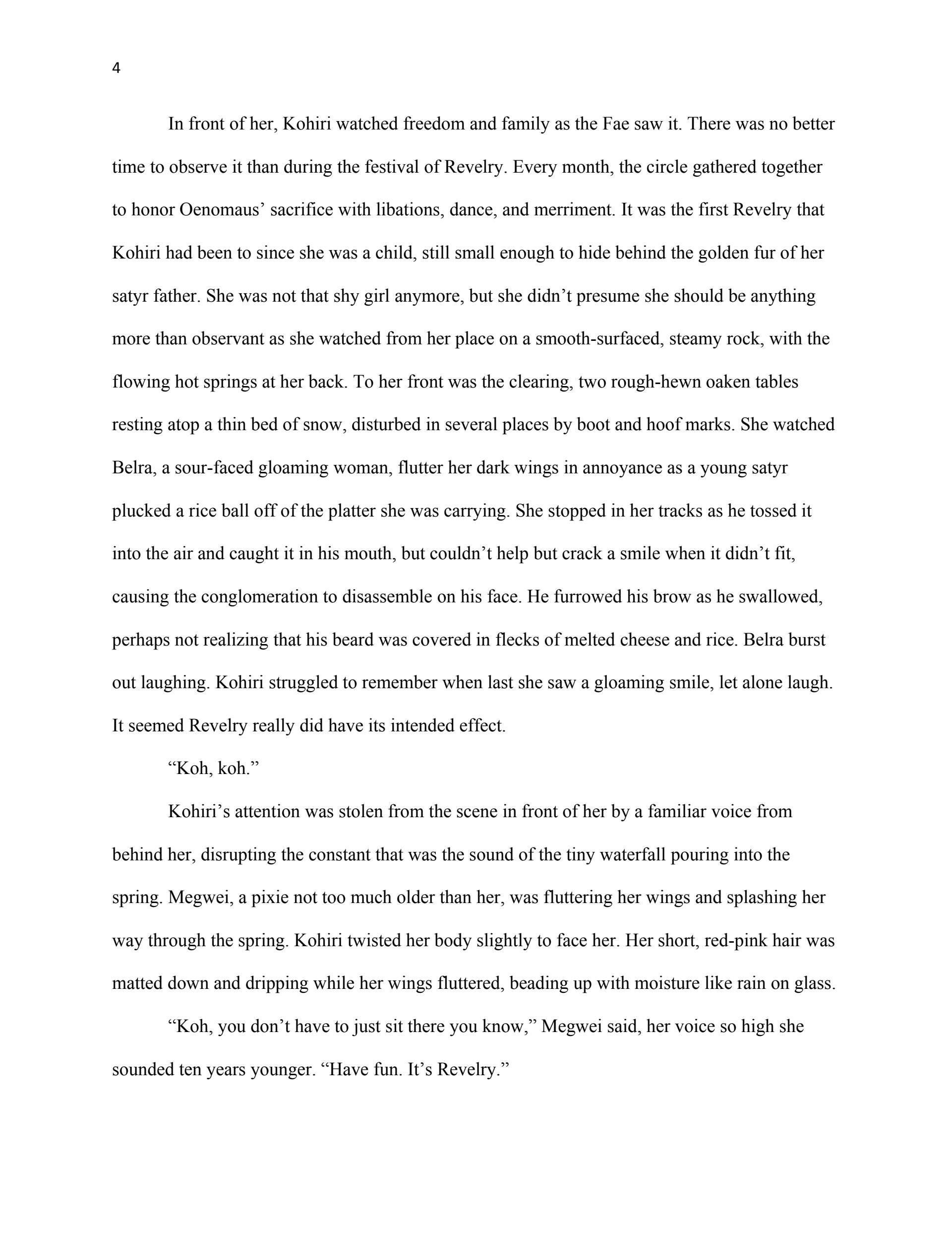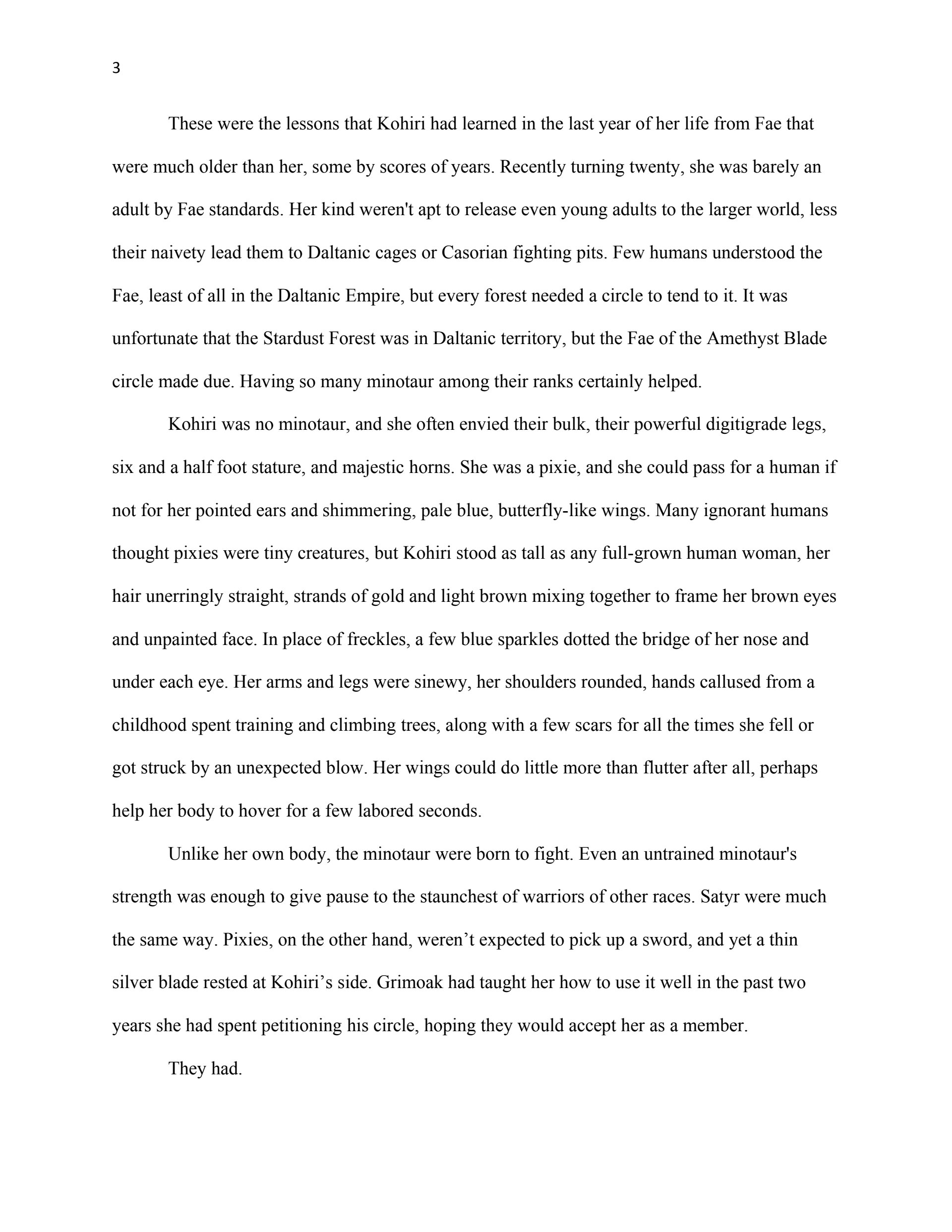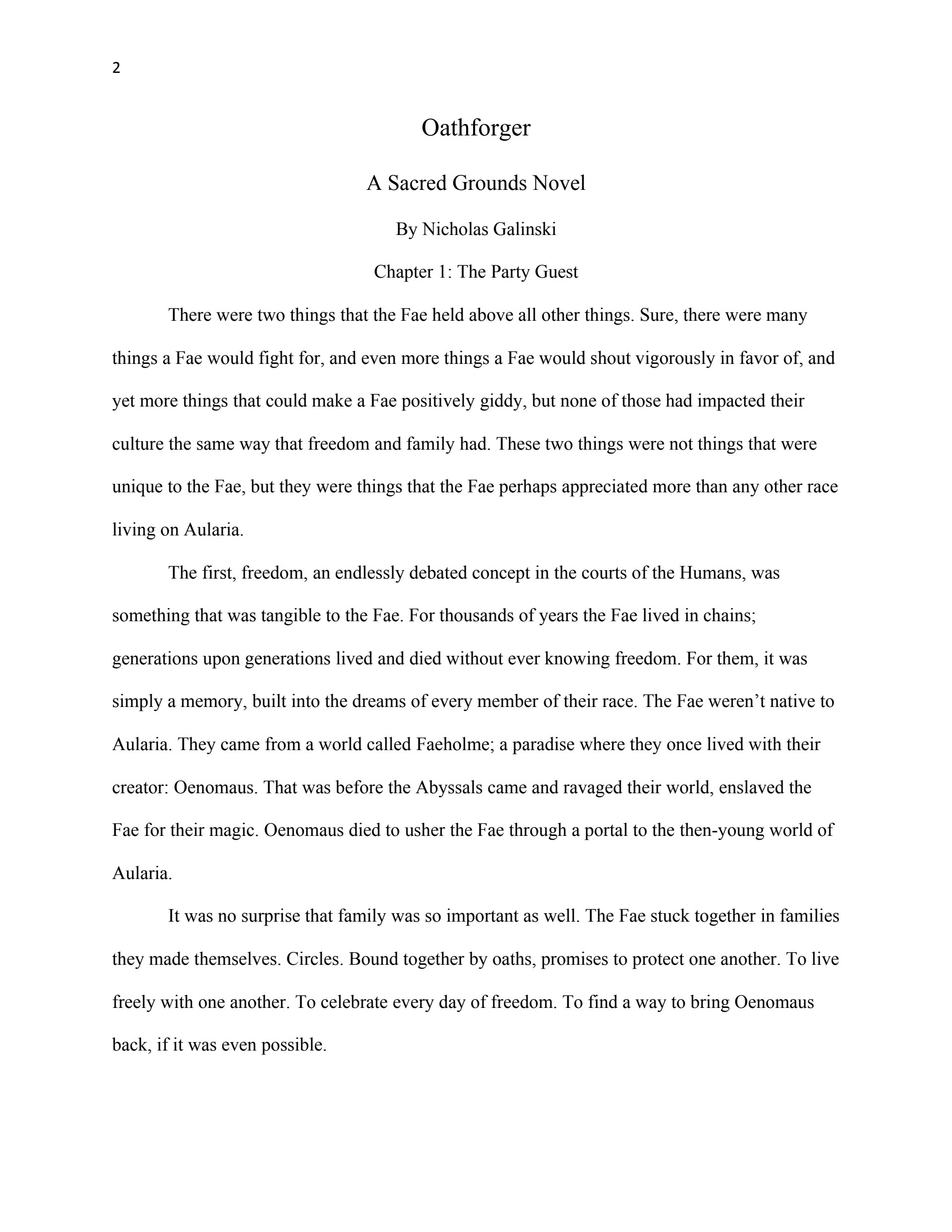 This writing sample was used as part of my thesis proposal for my Masters Degree in Creative Writing (Fiction Emphasis). The first chapter serves as an example of my ability to reveal planned world-building through narrative, create interesting characters, and write dialogue.