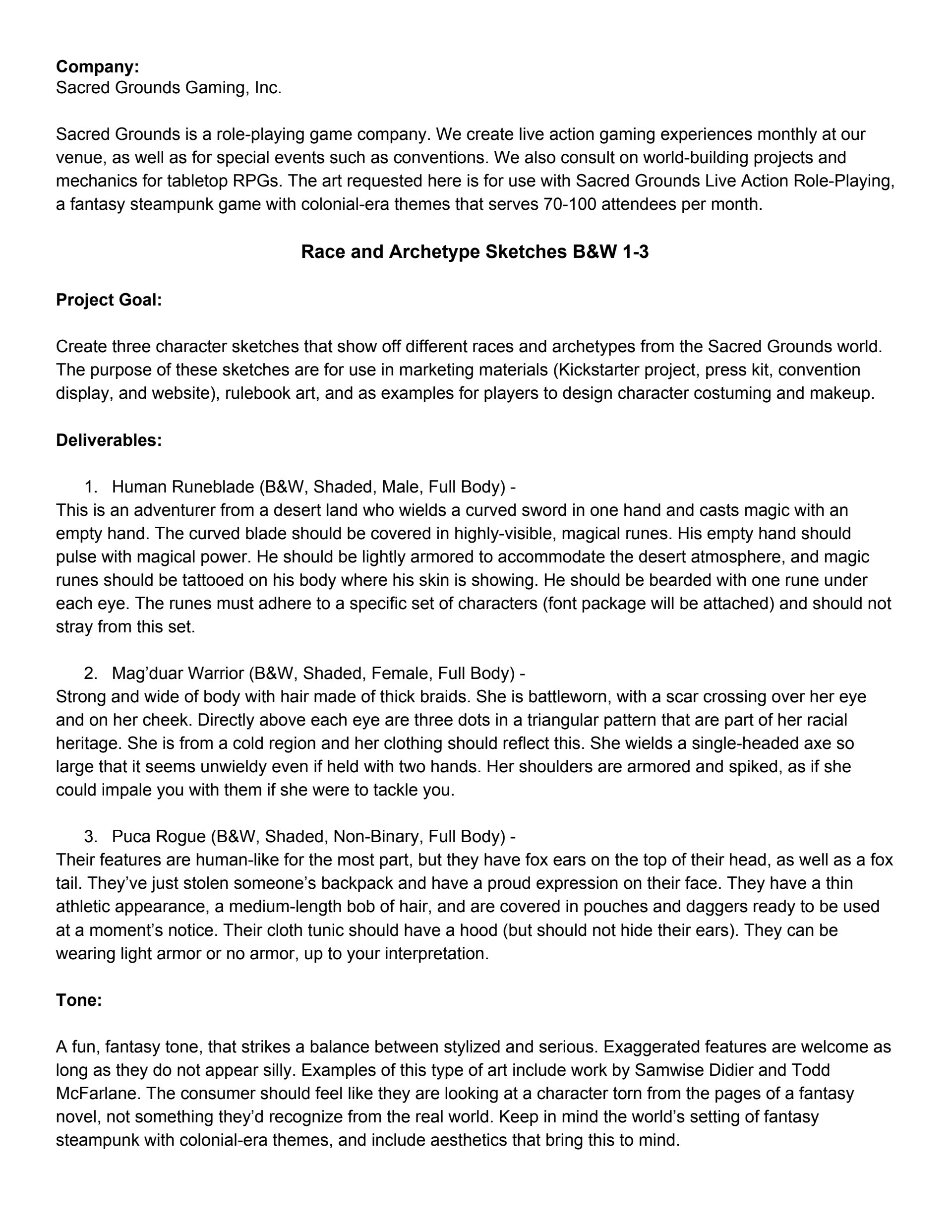 This is a sample art brief that I created at Sacred Grounds Gaming for use in marketing materials and the rule book. I was able to create a strong working relationship with the artist that eventually completed this commission, and continued to communicate with him using similar art briefs.